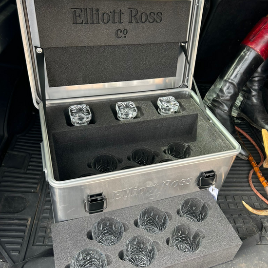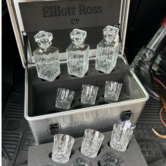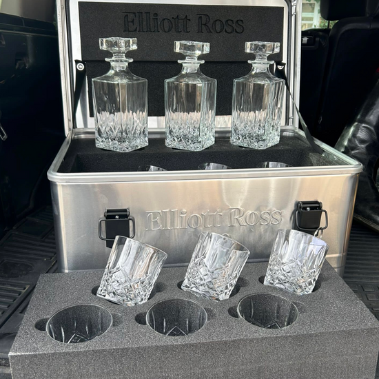 Elevate your entertaining wherever you go with the Elliott Ross Box, featuring three crystal-cut decanters and twelve crystal tumblers, each secured in precisely cut foam. Perfect for enjoying your favourite spirits at home or bringing style and sophistication to events on the move.