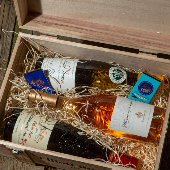 Each box comes with 3 bottles of wine, 1 white, 1 Rosé , 1 Red, plus two bars of Willies delicious chocolates, one salted and one which has the perfect blend of Milk and Dark chocolate. Simply divine!