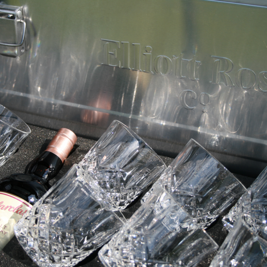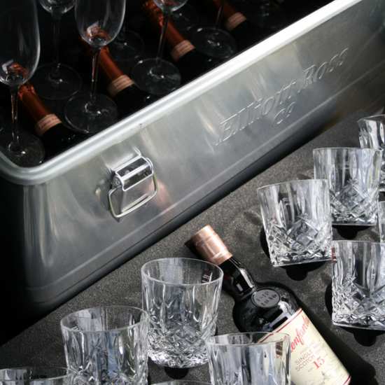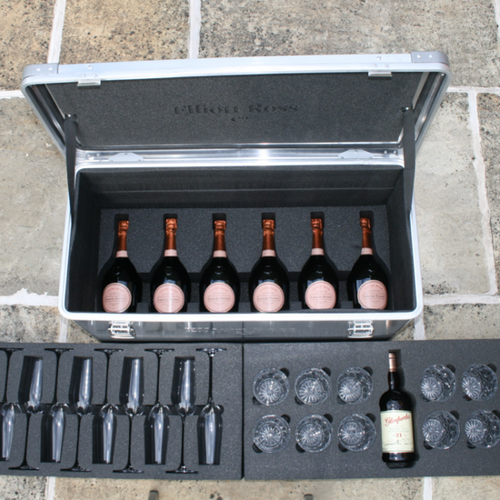 Travel in style and entertain effortlessly with this exquisite aluminium case, set with three layers of charcoal-grey cut foam to keep your crystal glasses, whisky, and champagne perfectly secure whether by land, sea, or air.