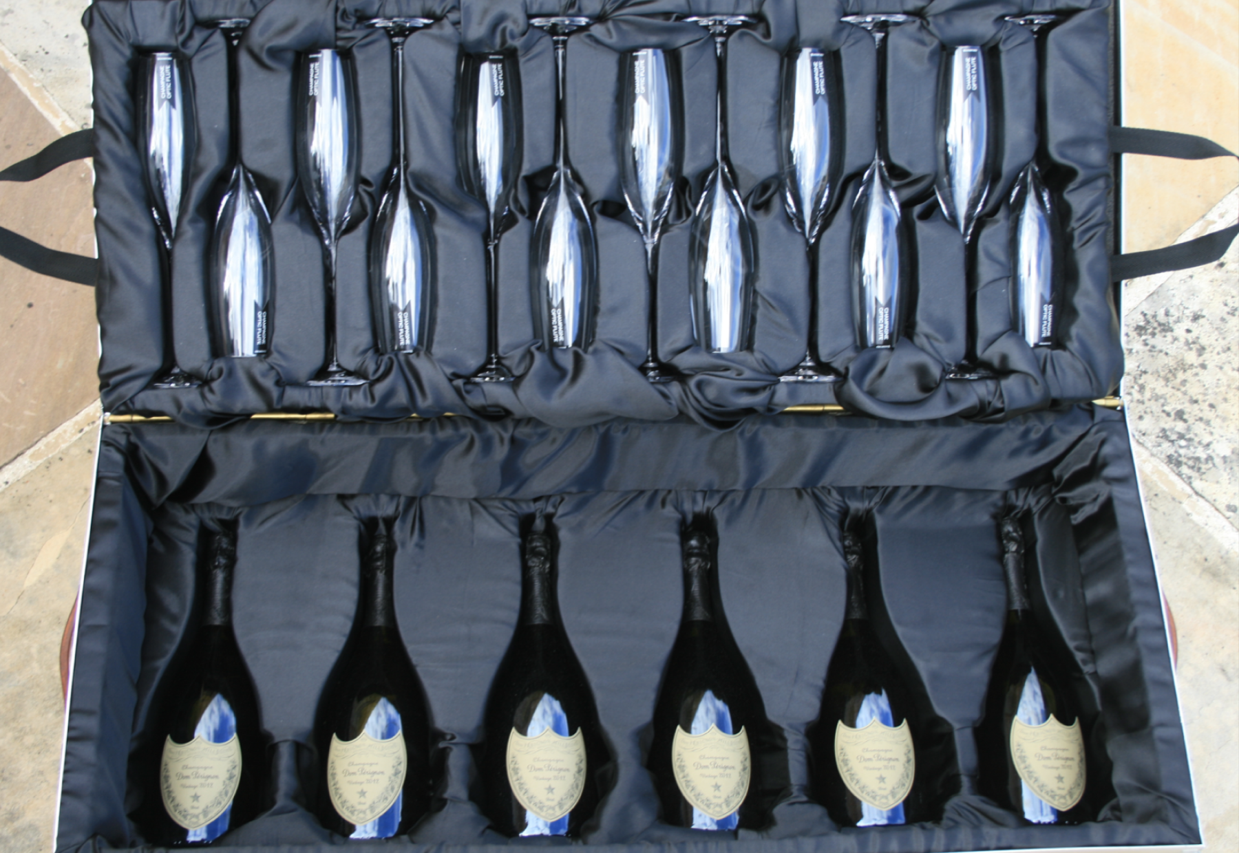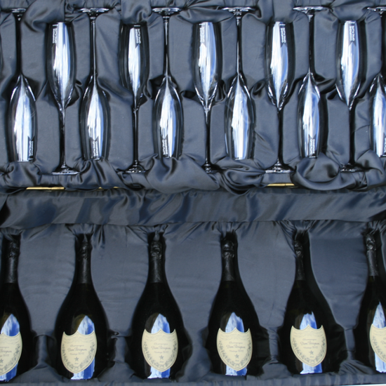 Each case comes with 6 bottles of Dom Pérignon and 12 elegant Waterford crystal champagne flutes.