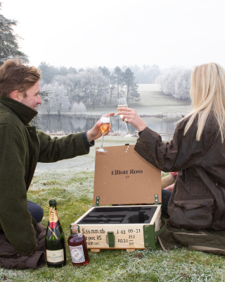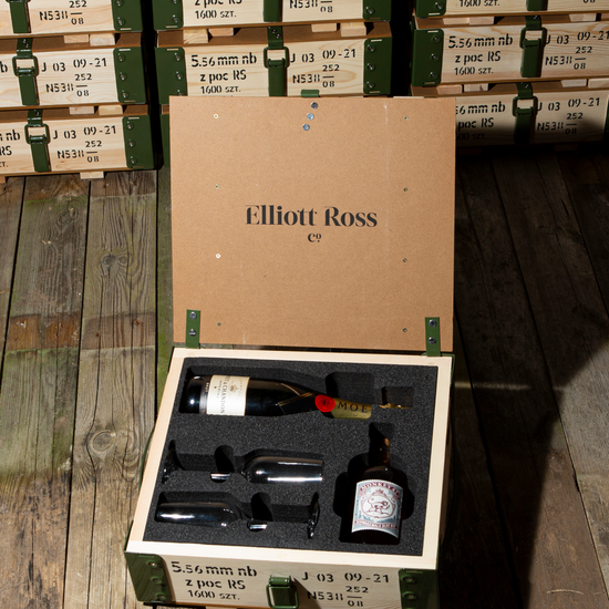 This box also comes with 1 bottle of Moet, 1 bottle Monkey 47 Sloe Gin and two tall stemmed crystal champagne glasses.